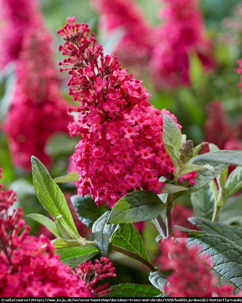 Efektowna, szczepiona na pniu Buddleja davidii w intensywnie czerwonym (karminowo-purpurowym) kolorze kwiatów to wyjątkowa ozdoba każdego ogrodu. Tworzy zgrabne „drzewko” o kulistej koronie i długich, pachnących kwiatostanach, które przyciągają motyle oraz inne owady zapylające.